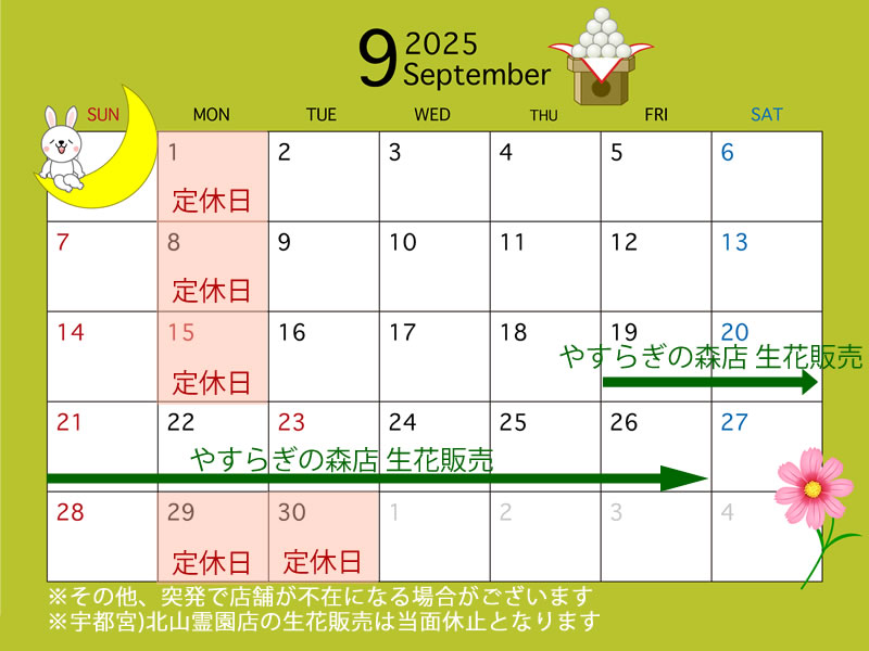ニュース 営業情報9月(生花販売情報) 2025年9月12日 by haguroya いつもお世話になっております。 今月の各店の営業情報となります。ご不便をおかけしますが、ご理解くださいます様よろしくお願い申し上げます。 ※やすらぎの森店の生花販売:19日~26日 最終日はなくなり次第終了 前日迄にご連絡いただくと、お取り置き可能です。 北山霊園店にてご相談を希望されるお客様は、お手数ですが事前にご連絡いただけますと幸いです。